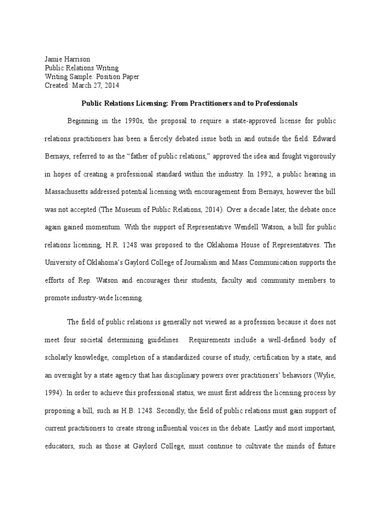 Position papers range from the simplest format of a letter to the editor, through to the most complex in the form of an academic position paper. Review with students the components of an effective position paper introduction. Talk to your tas about their individual expectations. The format of each positions paper, or position paper template, varies from conference to conference. Jul 29, 2019 · 4. Consult your assignment sheet, syllabus, or the parameters of the paper for how you should format your paper. However, even if you have no format instructions you do not want to have a messy position paper. Then add your heading and page numbers. Keep in mind, however, that this is just a guide. Position papers are also used by large organizations to make public the official beliefs and recommendations of the group. Position papers are also used by large organizations to make public the official beliefs and recommendations of the group. This can be done by posing a question, stating a relevant quote, making a strong statement, or using a statistic. A position paper introduction should: